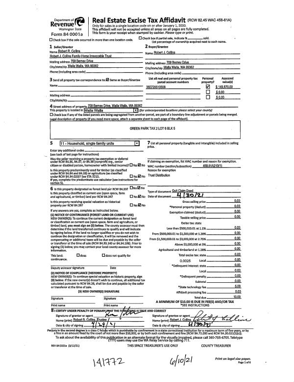 | 1 | 12/10/2020 | QCD | QUIT CLAIM DEED | COLLINS ROBERT J | COLLINS NATALIE | | | | 140531 | 2020-13109 |