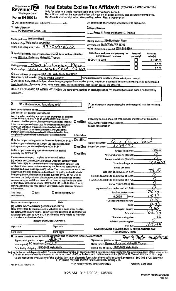 | 2 | 11/29/2022 | QCD | QUIT CLAIM DEED | PD INVESTMENT GROUP LLC | PORTER RENEE N & MICHAEL D THOMAS | | | $7,250.00 | 145266 | 2023-00272 |