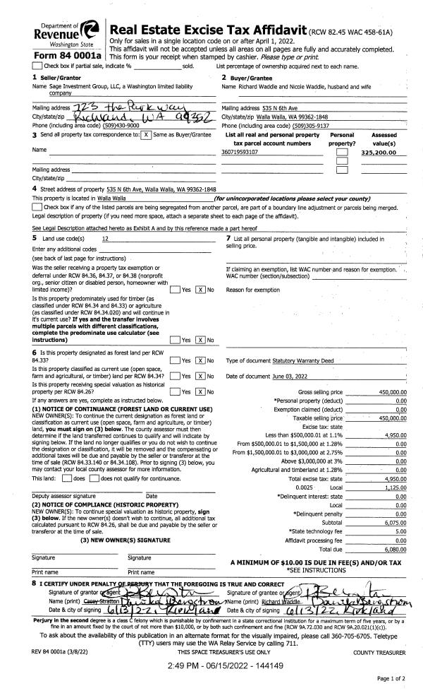 | 1 | 06/15/2022 | SWD | STATUTORY WARRANTY DEED | SAGE INVESTMENT GROUP LLC | WADDLE RICHARD & NICOLE | | | $450,000.00 | 144149 | 2022-05091 |