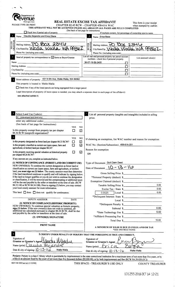 | Mailing Address: | 431 N 6TH AVE WALLA WALLA, WA 99362 | % Ownership: | 100.0000000000% |