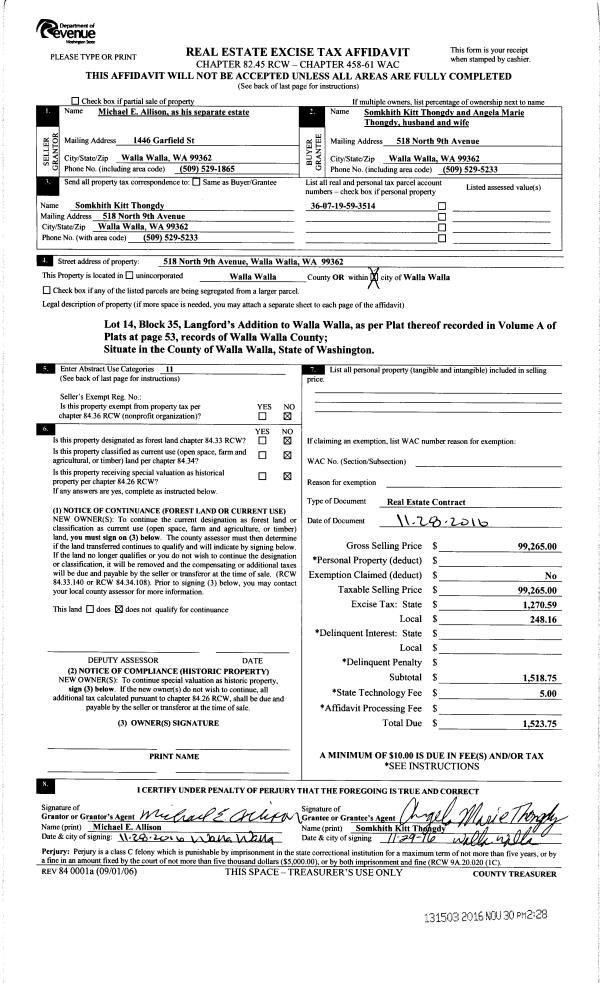 | 1 | 11/30/2016 | REAL ESTAT | REAL ESTATE CONTRACT | ALLISON MICHAEL E | THONGDY SOMKHITH KITT & ANGELA MARIE | | | $99,265.00 | 131503 | 2016-09805 |