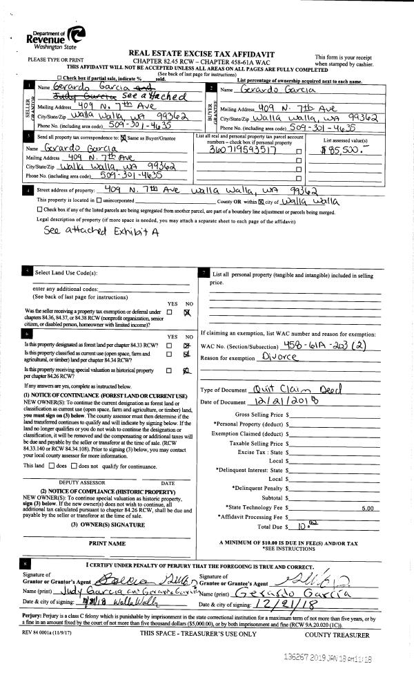 | 2 | 12/21/2018 | QCD | QUIT CLAIM DEED | GARCIA GERARDO & JUDY | GARCIA GERARDO | | | $0.00 | 136267 | 2019-00415 |