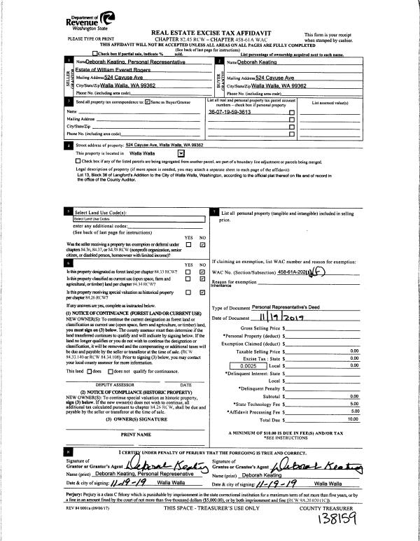 | 2 | 11/19/2019 | DPR | DEED OF PERSONAL REPRESENTATIVE | ROGERS WILLIAM | KEATING DEBORAH | | | $0.00 | 138159 | 2019-09810 |