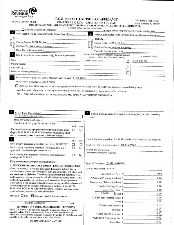 | 1 | 09/01/2015 | QCD | QUIT CLAIM DEED | PEREZ ZOCHILT I GILES | ROJAS CARLOS FLORES | | | | 128746 | 2015-07737 |