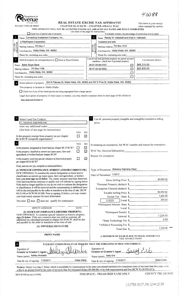 | 1 | 01/12/2017 | SWD | STATUTORY WARRANTY DEED | CONNECTICUT INVESTMENT CO | HALLOWELL RANDY W & KRISTI A | | 2-PARCLES | $80,000.00 | 131758 | 2017-00328 |