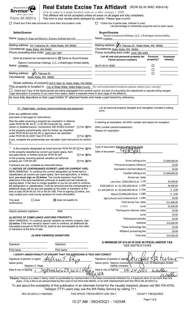 | 1 | 09/24/2021 | SWD | STATUTORY WARRANTY DEED | RAPP STEPHEN S | SATURNO COMMERCIAL HOLDINGS LLC | | | $1,000,000.00 | 142548 | 2021-11702 |