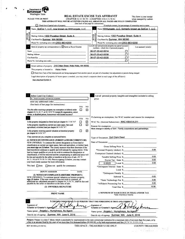 | 4 | 01/28/2015 | SWD | STATUTORY WARRANTY DEED | WALLA WALLA HOTEL LLC | SOL COR 1 LLC | 3 PARCELS | | $0.00 | 127344 | 2015-00751 |