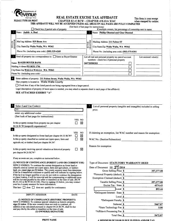 | 1 | 11/24/2014 | SWD | STATUTORY WARRANTY DEED | DEAL JUDITH A | OHNSTAD PHILLLIP & GINA | | | $357,377.00 | 127003 | 2014-08532 |