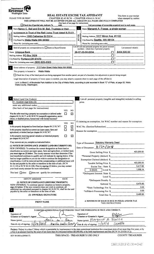 | 1 | 11/30/2018 | SWD | STATUTORY WARRANTY DEED | BALL LIVING TRUST | FRASSE MARGARET A | | | $423,255.00 | 136018 | 2018-09931 |