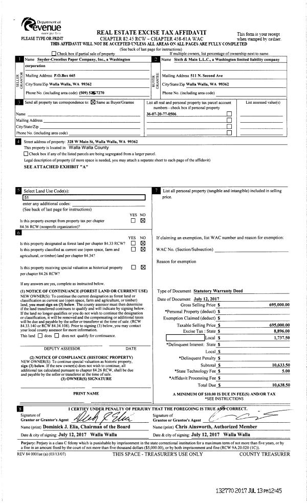 | 1 | 07/13/2017 | SWD | STATUTORY WARRANTY DEED | SNYDER-CRECELIUS PAPER CO INC | SIXTH & MAIN LLC | | | $695,000.00 | 132770 | 2017-05362 |