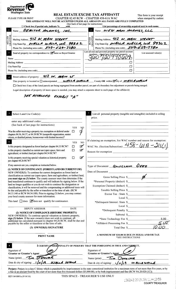 | 2 | 01/11/2019 | QCD | QUIT CLAIM DEED | DEMITOR HOLDINGS INC | WEST MAIN HOLDINGS LLC | | | $0.00 | 136242 | 2019-00245 |