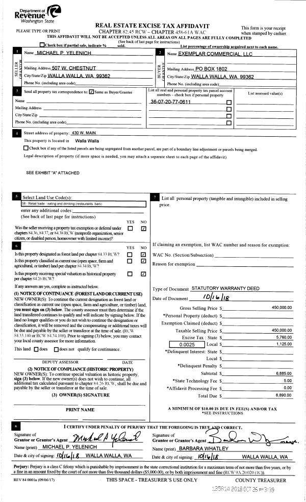 | 1 | 10/26/2018 | SWD | STATUTORY WARRANTY DEED | YELENICH MICHAEL P | EXEMPLAR COMMERCIAL LLC | | | $450,000.00 | 135814 | 2018-08874 |