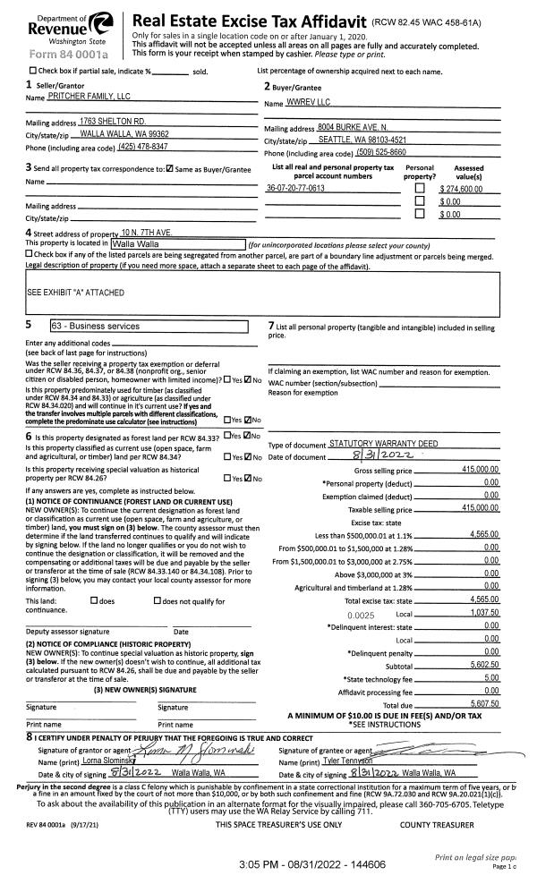 | 1 | 08/31/2022 | SWD | STATUTORY WARRANTY DEED | PRITCHER FAMILY LLC | WWREV LLC | | | $415,000.00 | 144606 | 2022-07320 |