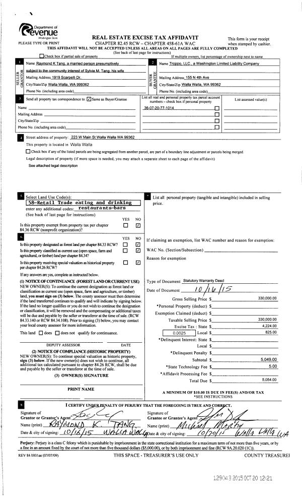 | 1 | 10/20/2015 | SWD | STATUTORY WARRANTY DEED | TANG RAYMOND K | TROPPO LLC | | | $330,000.00 | 129043 | 2015-09157 |