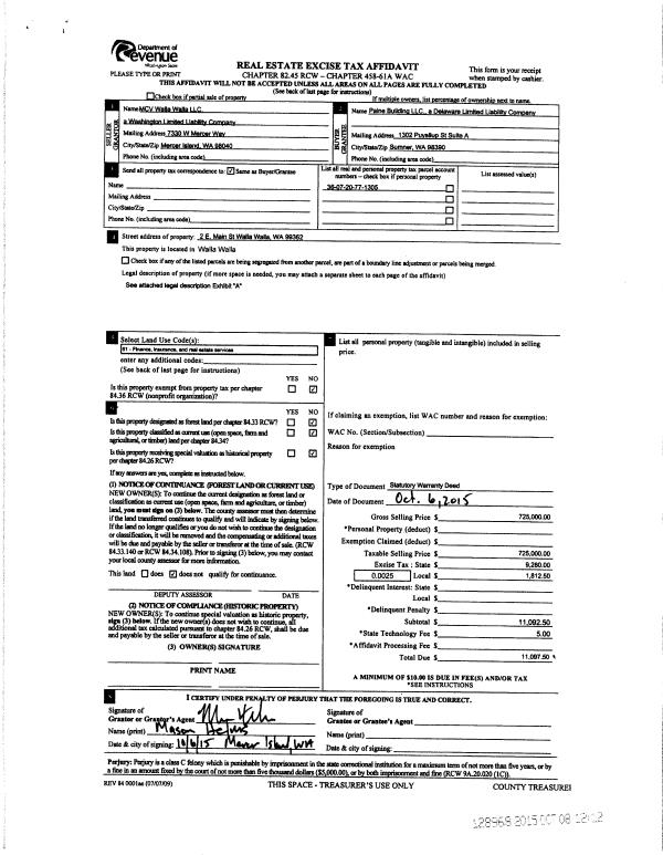 | 1 | 10/08/2015 | SWD | STATUTORY WARRANTY DEED | MCV WALLA WALLA LLC | PAINE BUILDING LLC | | | $725,000.00 | 128968 | 2015-08876 |