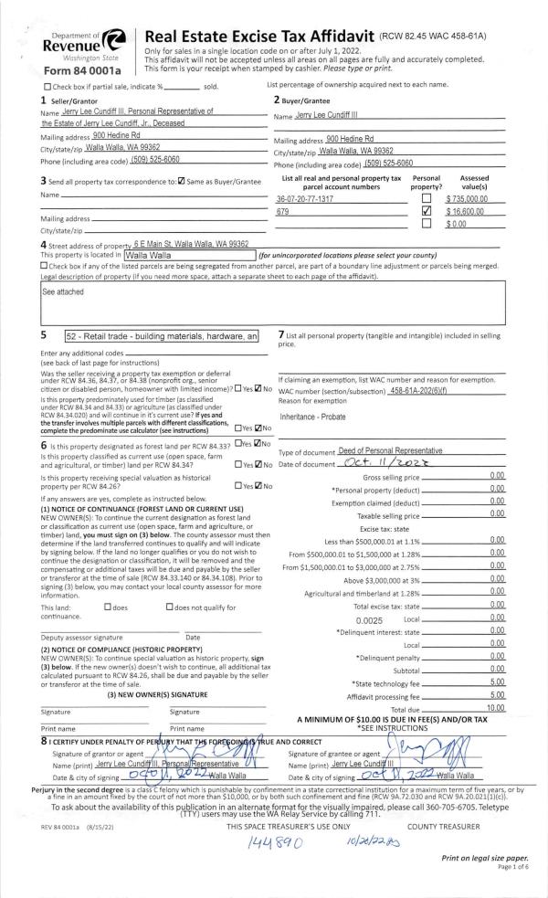 | 1 | 10/20/2022 | DPR | DEED OF PERSONAL REPRESENTATIVE | CUNDIFF JERRY JR ESTATE OF | CUNDIFF JERRY LEE III | | | $0.00 | 144890 | 2022-08592 |