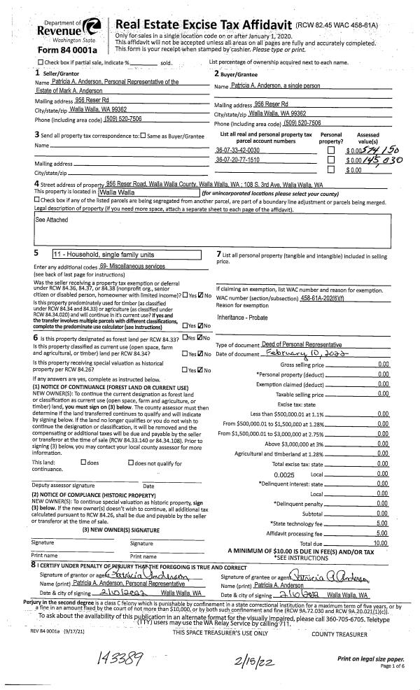 | 2 | 02/10/2022 | DPR | DEED OF PERSONAL REPRESENTATIVE | ANDERSON MARK A & PATRICIA A | ANDERSON PATRICIA A | 2 PARCELS | | $0.00 | 143389 | 2022-01374 |
