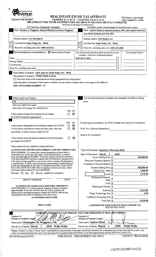 | 1 | 03/05/2018 | SWD | STATUTORY WARRANTY DEED | WAGGONER HERBERT L ESTATE OF | REED ANDREW | | | $550,000.00 | 134255 | 2018-01760 |