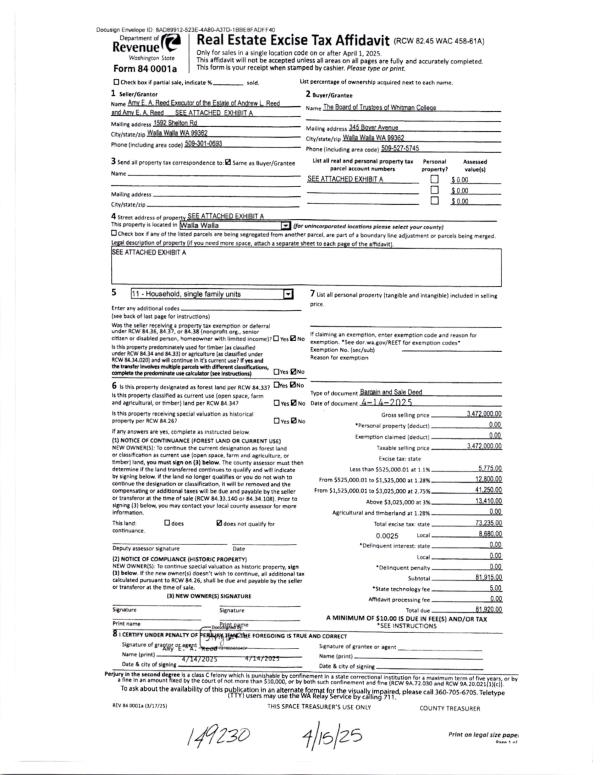 | 1 | 04/14/2025 | BARGAIN & | BARGAIN & SALE DEED | REED ANDREW L & AMY | BOARD OF TRUSTEES OF WHITMAN COLLEGE | | 11-PARCELS | $3,472,000.00 | 149230 | 2025-01982 |