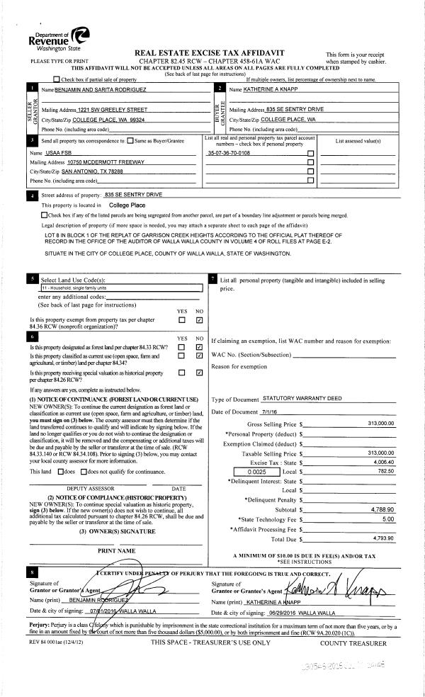 | 1 | 07/01/2016 | SWD | STATUTORY WARRANTY DEED | RODRIGUEZ BENJAMIN & SARITA | KNAPP KATHERINE A | | | $313,000.00 | 130546 | 2016-05101 |