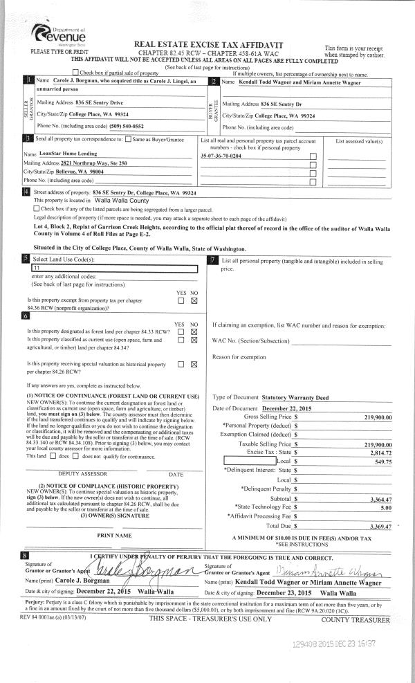 | 4 | 12/23/2015 | SWD | STATUTORY WARRANTY DEED | BURGMAN CAROLE JEAN | WAGNER KENDALL TODD & MIRIAM ANNETTE | | | $219,900.00 | 129408 | 2015-11016 |
