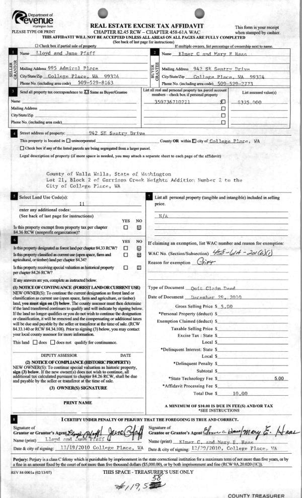 | 3 | 12/29/2010 | QCD | QUIT CLAIM DEED | PFAFF, LLOYD & JUNE | HAAS, ELMER C & MARY E | | | | 119558 | 2010-10803 |