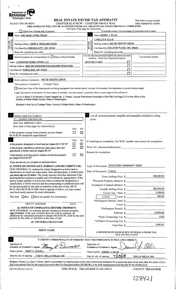 | 1 | 07/17/2015 | SWD | STATUTORY WARRANTY DEED | HAAS LIVING TRUST | ELLIS DANIEL J & LYNELLE R | | | $260,000.00 | 128421 | 2015-06119 |