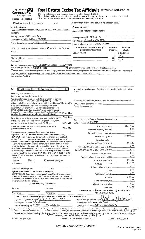 | 1 | 09/05/2023 | DPR | DEED OF PERSONAL REPRESENTATIVE | PFAFF LLOYD A & JUNE ESTATE OF | HEBARD ALFRED & TERRI | | | $512,500.00 | 146425 | 2023-05132 |
