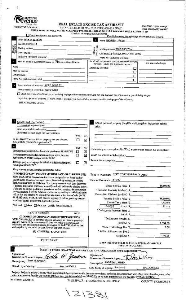 | 3 | 02/10/2012 | WARRANTY D | WARRANTY DEED | JENSEN, ERIK W | REED, ANDREW L | | | $88,500.00 | 121381 | 2012-01189 |