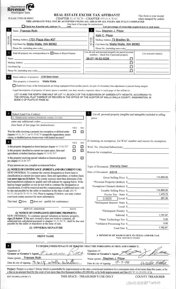 | 1 | 09/07/2018 | WARRANTY D | WARRANTY DEED | ROTH FRANCES | PITZER STEPHEN J & KELLI C | | | $114,900.00 | 135493 | 2018-07417 |