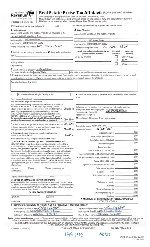 | 1 | 03/31/2025 | QCD | QUIT CLAIM DEED | VIOLETTE LEO & JUDITH LIVING TRUST | VIOLETTE LEO O JR & JUDITH J | | | | 149145 | 2025-01693 |
