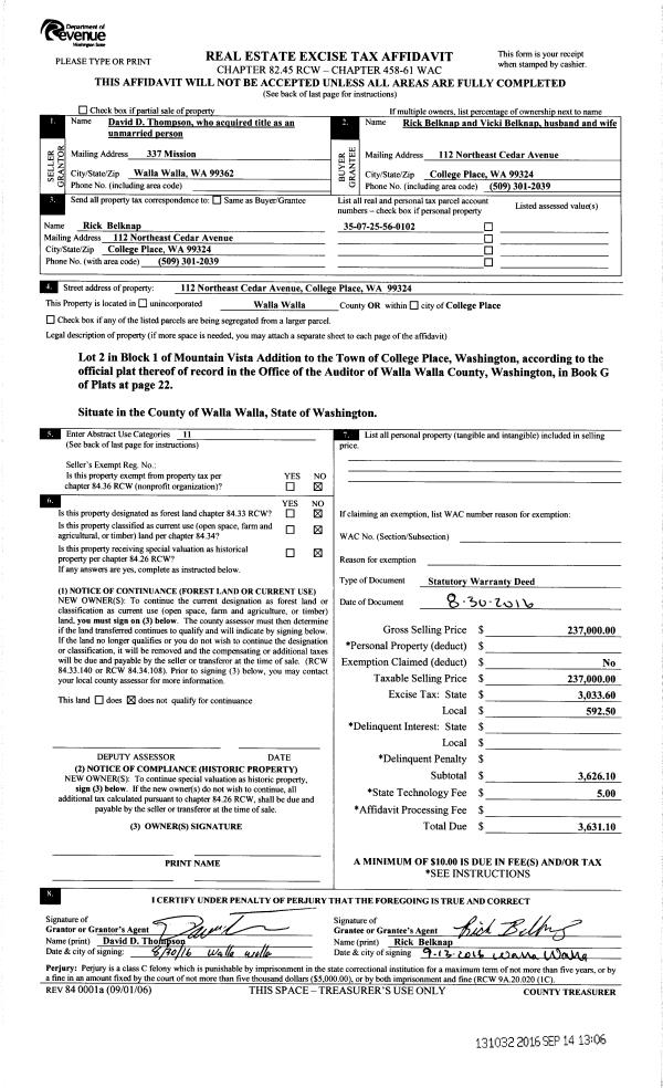 | 1 | 09/14/2016 | SWD | STATUTORY WARRANTY DEED | THOMPSON DAVID D | BELKNAP RICK & VICKI | | | $237,000.00 | 131032 | 2016-07496 |