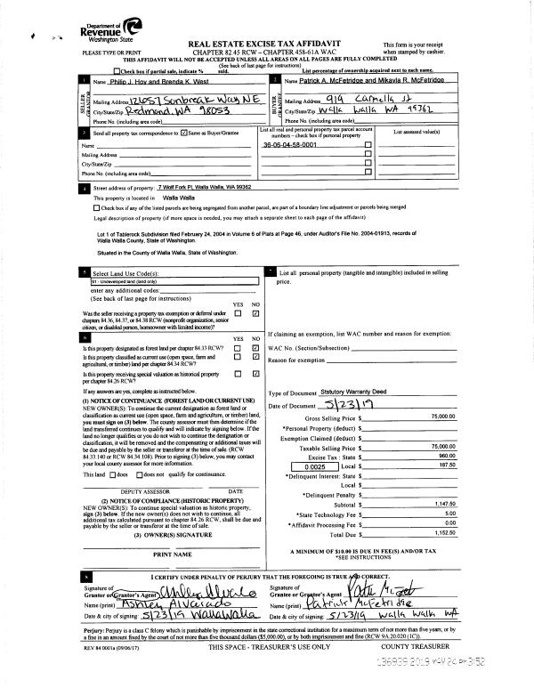 | 1 | 05/24/2019 | SWD | STATUTORY WARRANTY DEED | HOY PHILIP J | MC FETRIDGE PATRICK A & MIKAYLA R | | | $75,000.00 | 136939 | 2019-03532 |