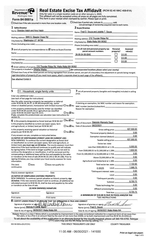 | 1 | 06/30/2021 | SWD | STATUTORY WARRANTY DEED | HATCH BRANDON & AMY | SOUZA FRED D & JODETTE T | | | $627,500.00 | 141930 | 2021-07933 |