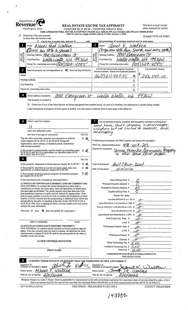 | 1 | 02/02/2022 | QCD | QUIT CLAIM DEED | WALKER ALBERT F & JANET K | WALKER JANET K | | | $0.00 | 143352 | 2022-01102 |