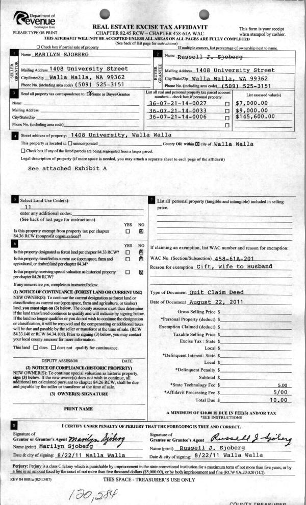 | 2 | 08/23/2011 | QCD | QUIT CLAIM DEED | SJOBERG, MARILYN | SJOBERG, RUSSELL J | | | | 120584 | 2011-06597 |