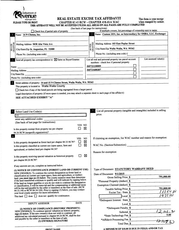 | 3 | 09/03/2015 | SWD | STATUTORY WARRANTY DEED | 14 N CLINTON INC | SMBA LLC | | 2-PARCELS | $791,000.00 | 128759 | 2015-07788 |