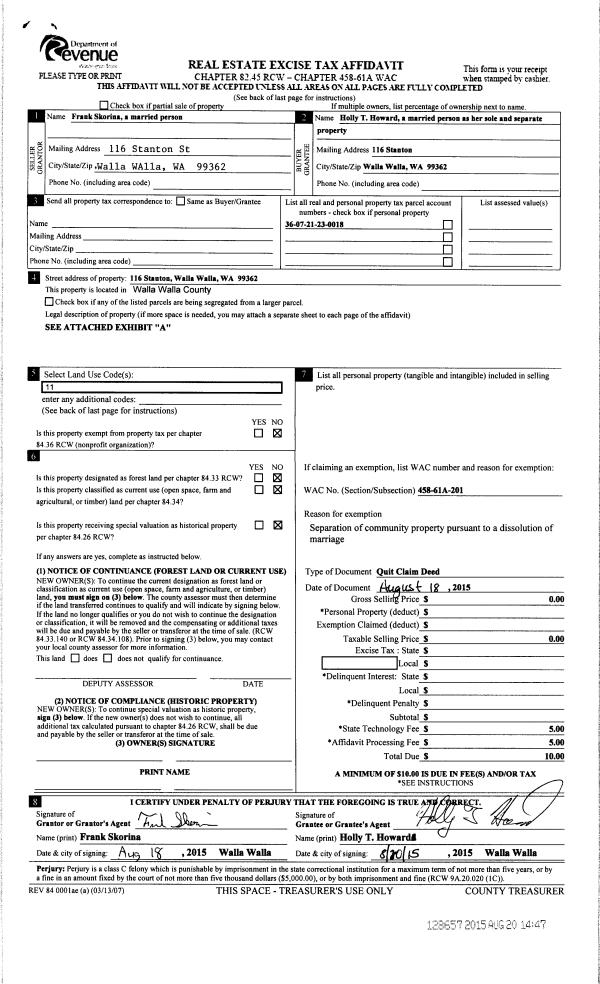 | 1 | 08/20/2015 | QCD | QUIT CLAIM DEED | SKORINA FRANK K | HOWARD HOLLY T | | | $0.00 | 128657 | 2015-07297 |