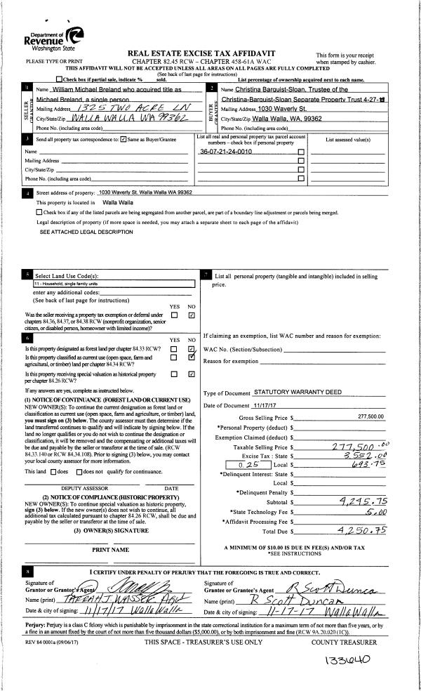 | 3 | 11/17/2017 | SWD | STATUTORY WARRANTY DEED | BRELAND MICHAEL | CHRISTINA-BARQUIST-SLOAN | | | $277,500.00 | 133640 | 2017-09310 |