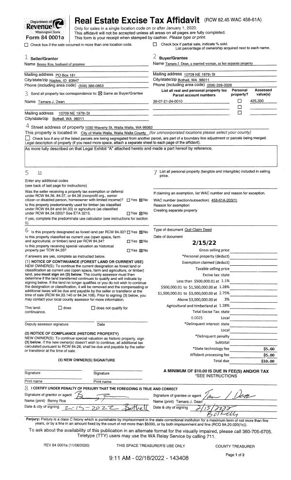 | 1 | 02/18/2022 | QCD | QUIT CLAIM DEED | ROA BENNY | DEAN TAMARA J | | | | 143408 | 2022-01470 |