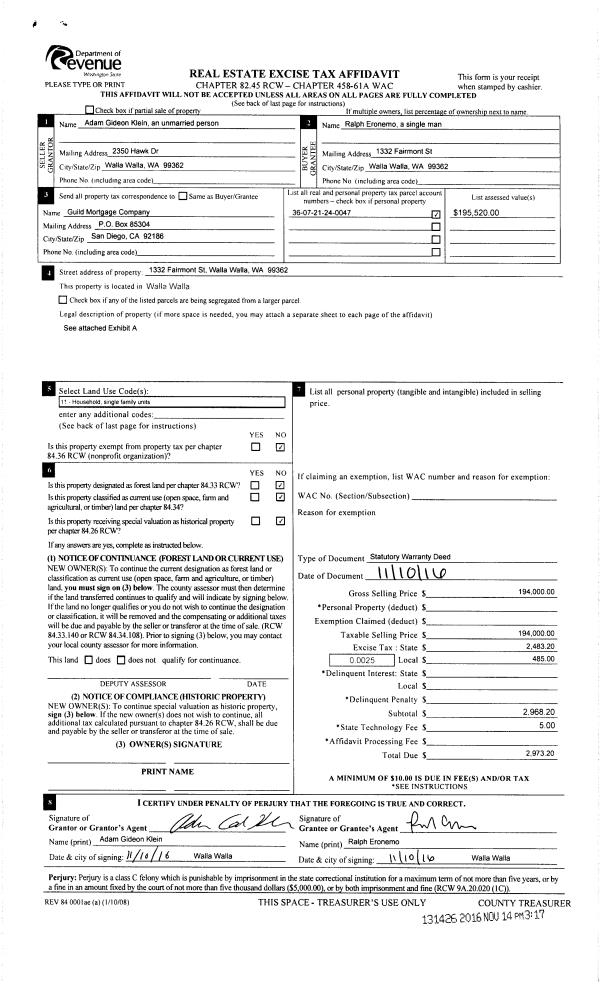 | 1 | 11/14/2016 | SWD | STATUTORY WARRANTY DEED | KLEIN ADAM GIDEON | ERONEMO RALPH | | | $194,000.00 | 131426 | 2016-09425 |