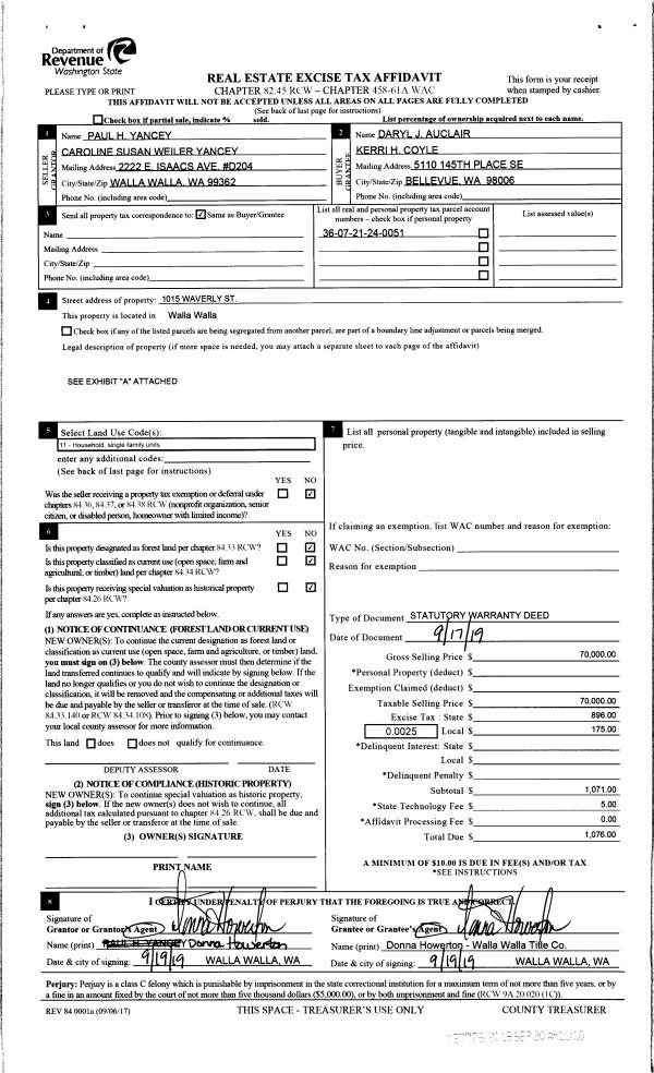 | 4 | 09/20/2019 | SWD | STATUTORY WARRANTY DEED | YANCEY PAUL H | AUCLAIR DARYL J | | | $70,000.00 | 137726 | 2019-07394 |