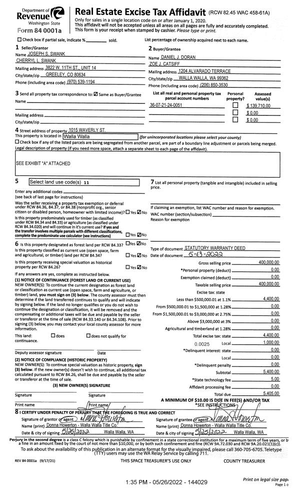 | 1 | 05/26/2022 | SWD | STATUTORY WARRANTY DEED | SWANK JOSEPH S & CHERRYL L | DORAN DANIEL J & ZOE J CATSIFF | | | $400,000.00 | 144029 | 2022-04552 |