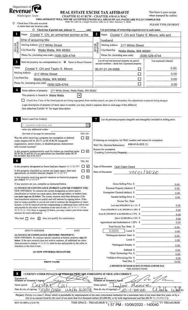| 1 | 10/06/2020 | QCD | QUIT CLAIM DEED | CHI CRYSTAL Y | CHI CRYSTAL Y & TAYLOR S MOORE | | | | 140040 | 2020-10312 |