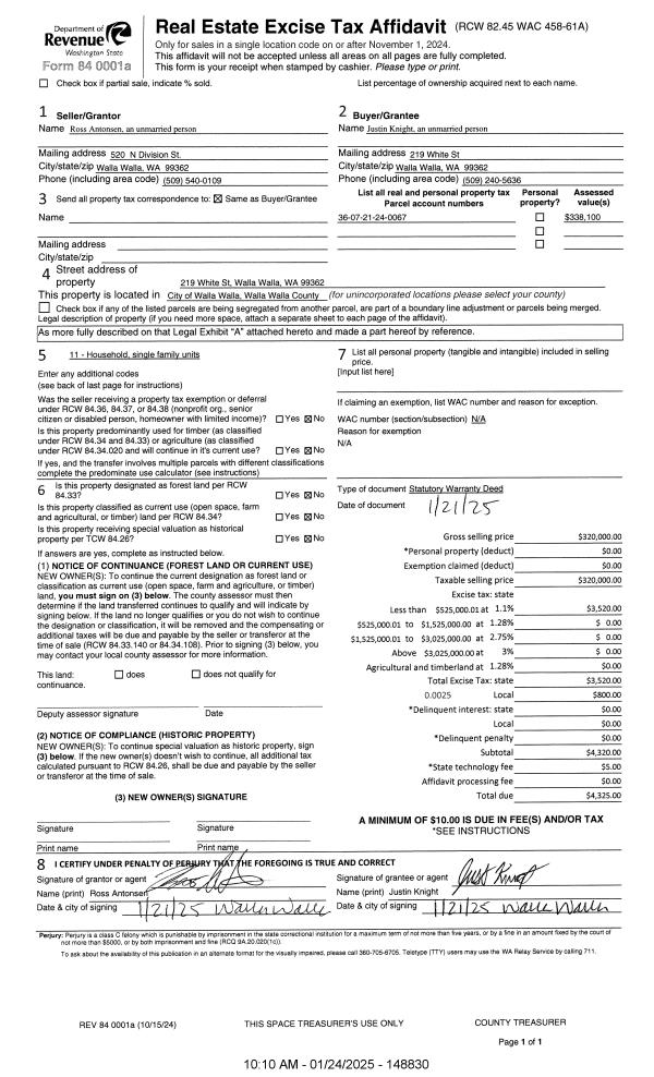 | 1 | 01/24/2025 | SWD | STATUTORY WARRANTY DEED | ANTONSEN ROSS | KNIGHT JUSTIN | | | $320,000.00 | 148830 | 2025-00390 |