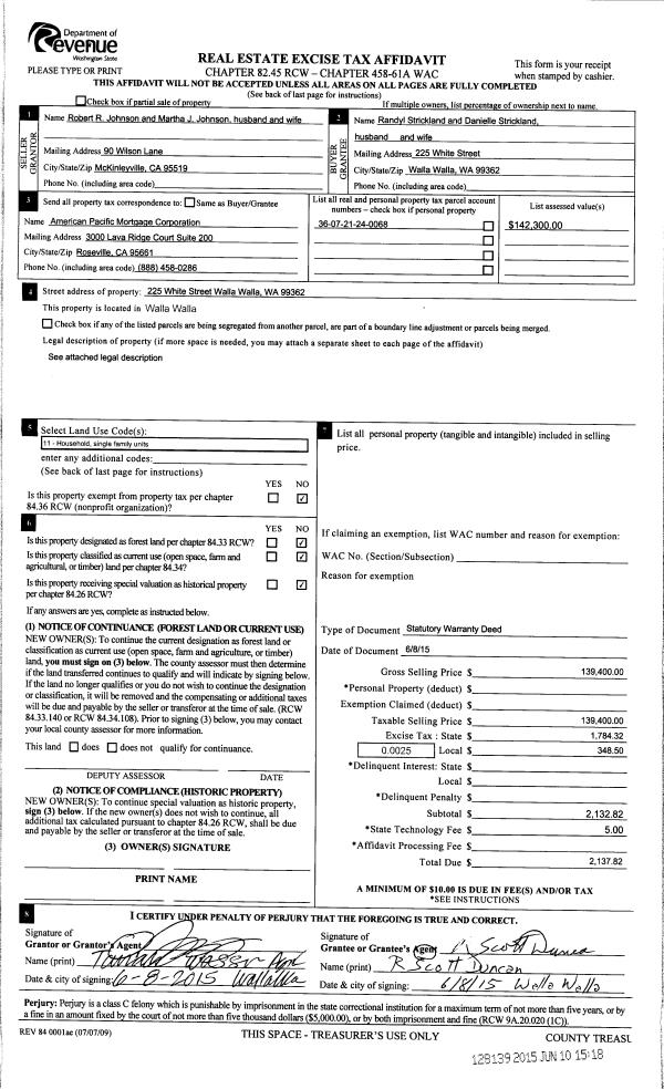 | 4 | 06/10/2015 | SWD | STATUTORY WARRANTY DEED | JOHNSON ROBERT R & MARTHA J | STRICKLAND RANDYL & DANIELLE | | | $139,400.00 | 128139 | 2015-04904 |