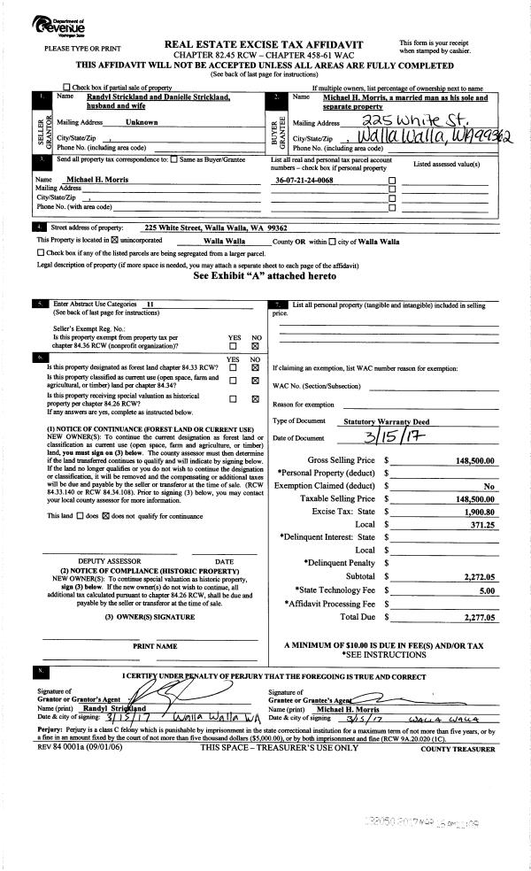 | 3 | 03/16/2017 | SWD | STATUTORY WARRANTY DEED | STRICKLAND RANDYL & DANIELLE | MORRIS MICHAEL H | | | $148,500.00 | 132050 | 2017-02029 |