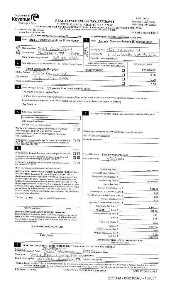 | 1 | 06/23/2020 | SWD | STATUTORY WARRANTY DEED | HENDERSON BRAD L & LISA D | DANE AARON N & MELANIE S THOMAS | | | $385,000.00 | 139337 | 2020-05779 |