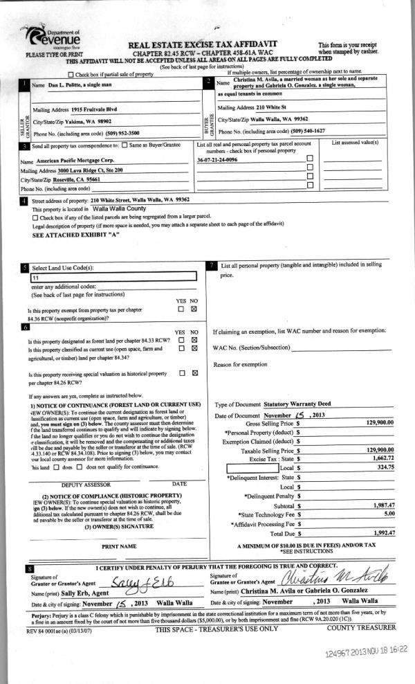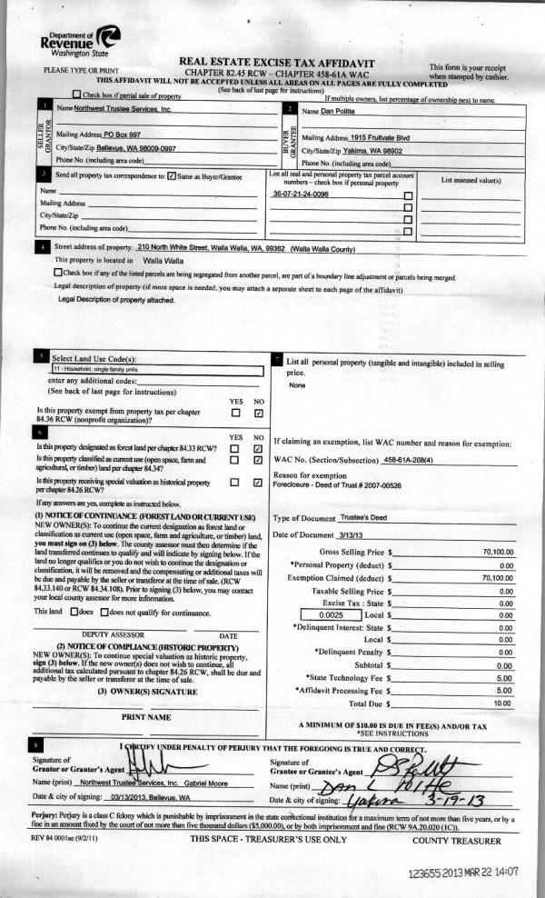 | 5 | 03/22/2013 | WARRANTY D | WARRANTY DEED | NORTHWEST TRUSTEE SERVICES INC | POLITTE, DAN L | | | $70,100.00 | 123655 | 2013-02734 |