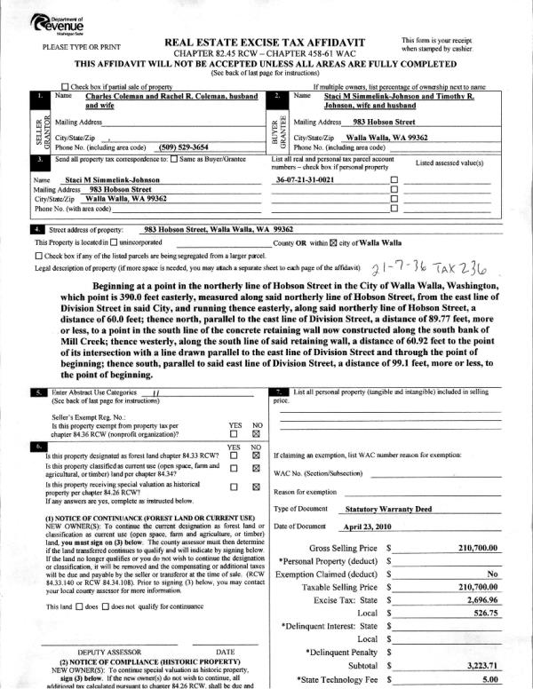 | 2 | 04/26/2010 | WARRANTY D | WARRANTY DEED | COLEMAN, CHARLES & RACHEL R | JOHNSON, TIMOTHY R | | | $210,700.00 | 118385 | 2010-03213 |